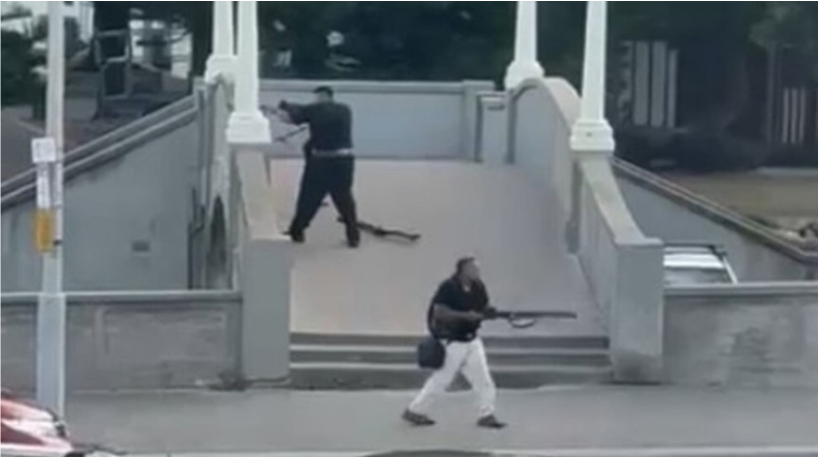 监控画面显示:一名路人男子走向持枪凶手夺枪时与其扭打在一起。图源:澳媒