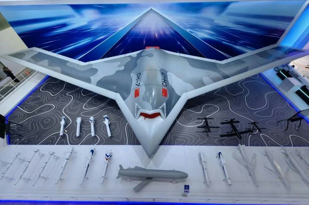 彩虹7由中国航空工业集团开发,外形科幻,翼展超过27米,形同蝙蝠的飞翼布局,类似美军B2轰炸机或X47B无人机。