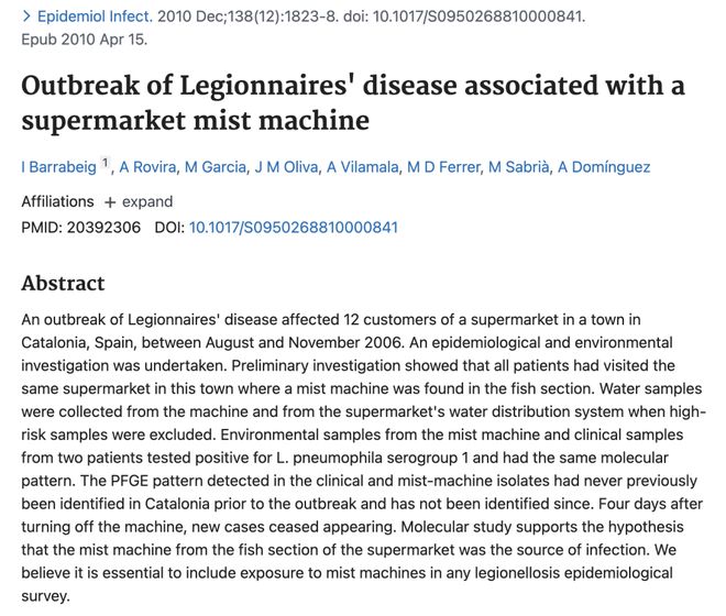 如果只是难闻,那顶多算是一次糟糕的消费体验。但当水变成了气溶胶,事情的性质就变了。2006年,加泰罗尼亚一家超市的蔬菜保鲜喷雾系统因为长期未彻底清洗,导致嗜肺军团菌(Legionella pneumophila)在管道内大量繁殖,最终喷出的带菌水雾导致12名顾客感染了严重的肺炎 。