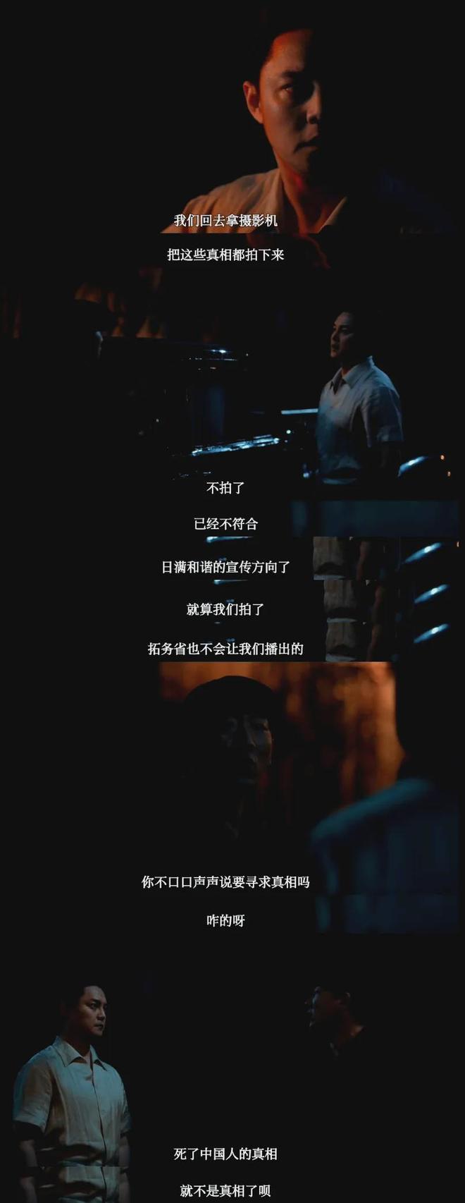 尹正饰演的日本导演更让人印象深刻,他把一个口口声声说用摄影机记录真相,但是真遇到日军残害中国人的事实时,却选择逃避和自我洗脑的自欺欺人,演绎得真实又细腻。而且他日语台词和汉语“外语感”切换得自然流畅,完全看不出表演痕迹,可见对这个角色是真下功夫了。