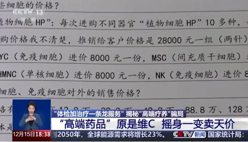 普通藥劑及保健品被包裝後,身價倍漲:「血液養護」項目成本100多元,售價29900元;「肝腎養護」項目成本100多元,售價49900元;「細胞」產品進價2000至8000元不等,套餐售價12.8萬元到128萬元不等。