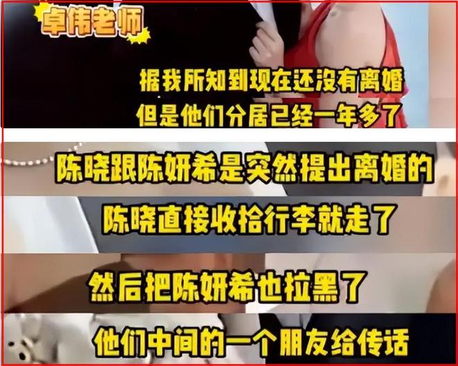 根据“中国第一狗仔”卓伟的爆料可知,在离婚之前,陈晓和陈妍希已经分居了,并且陈晓将陈妍希拉黑了,他们之间沟通还需要中间人传话。