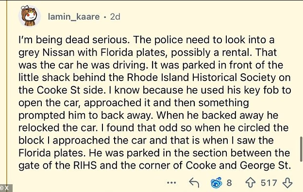 警方公布枪击案“重要线索人物”照片后,John 在社交平台 Reddit 上发帖称自己认出了嫌疑人,并提醒警方注意一辆可能为租赁车辆的灰色日产轿车。
