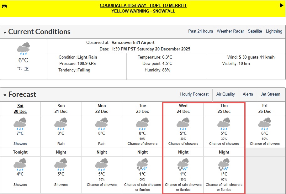 (加西网综合) 大温地区的居民对圣诞节的雨水已经习以为常,但今年有些人——尤其是海拔较高地区——可能在清晨看到零星雪花。