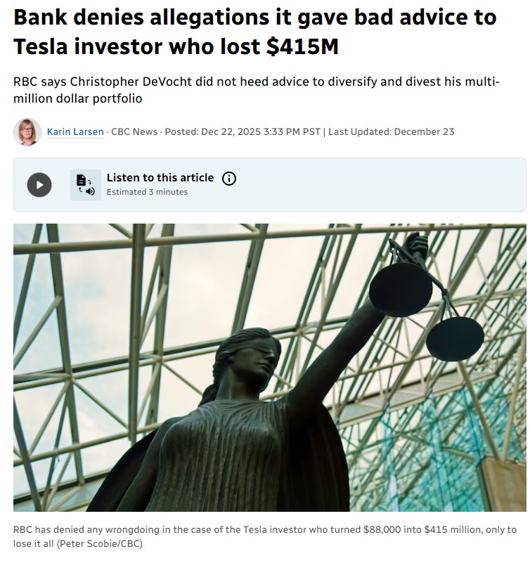(加西网综合)BC省男子在特斯拉股票上赚得又亏掉 4.15 亿元后起诉 银行,称提供“不充分的投资建议”