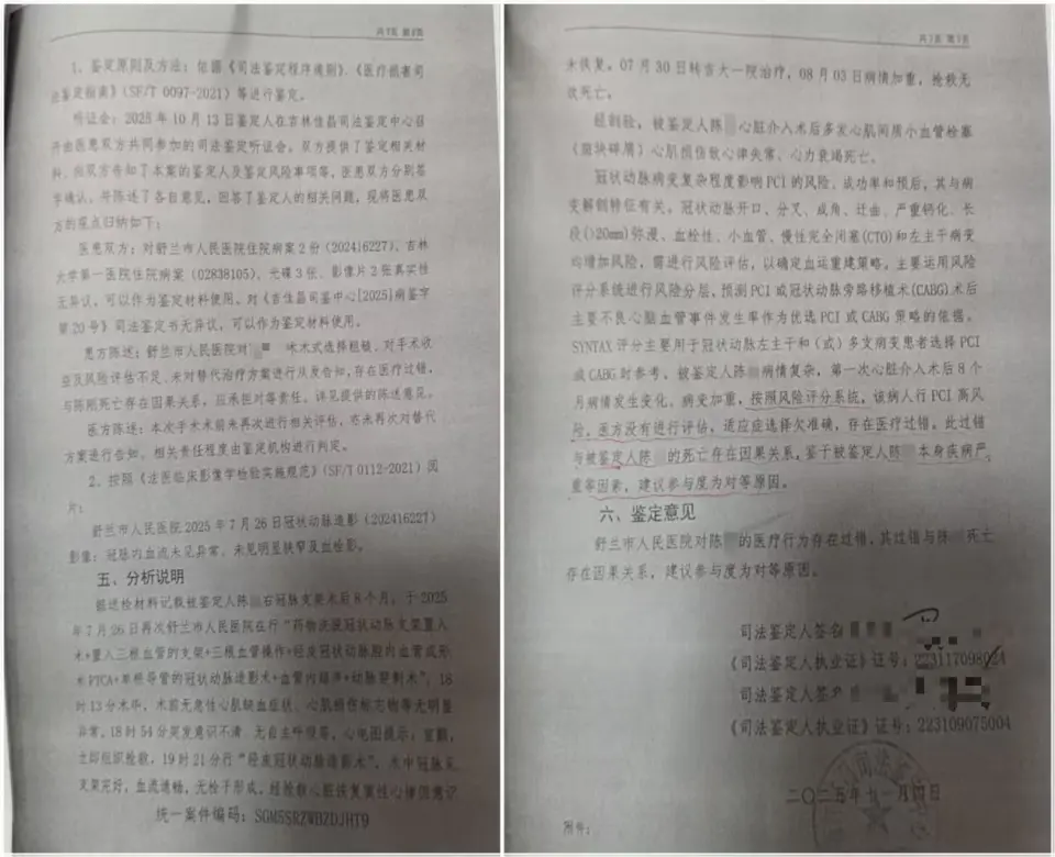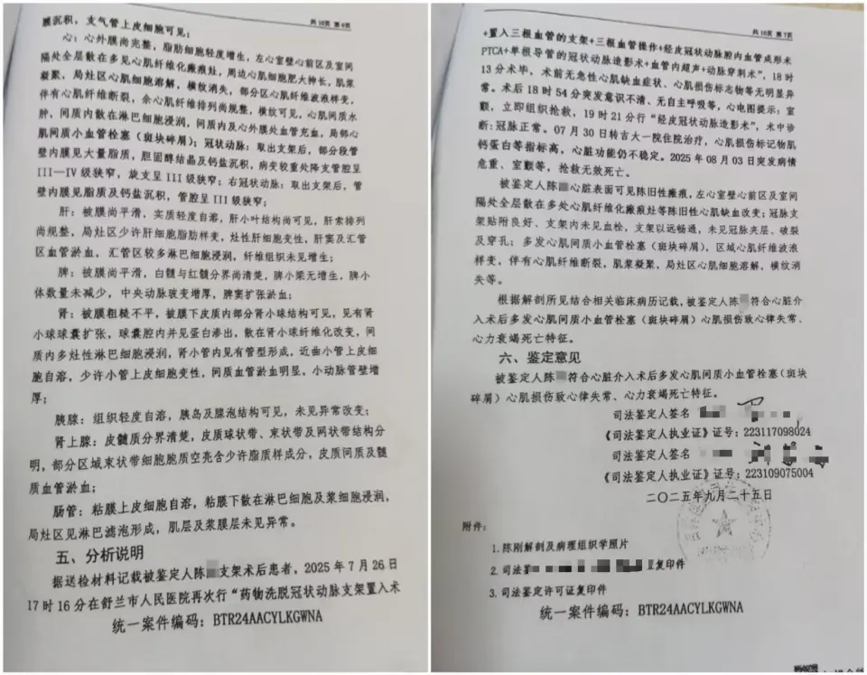 2025年8月,陈先生妻子和医院共同委托鉴定机构进行鉴定。报告中称,2025年7月26日17时16分,在舒兰市人民医院再次行“药物洗脱冠状动脉支架置入术+置入三根血管的支架+三根血管操作+经皮冠状动脉腔内血管成形术PTCA+单根导管的冠状动脉造影术+血管内超声+动脉穿刺术”,18时13分术毕,术前无急性心肌缺血症状、心肌损伤标志物等无明显异常。术后18时54分突发意识不清、无自主呼吸等,心电图提示:室颤,立即组织抢救,19时21分行“经皮冠状动脉造影术”,术中诊断:冠脉正常。7月30日转吉大一院住院治疗,心肌损伤标记物肌钙蛋白等指标高,心脏功能仍不稳定。8月3日突发病情危重、室颤等,抢救无效死亡。鉴定结果为被鉴定人符合心脏介入术后多发心肌间质小血管栓塞(斑块碎屑)心肌损伤致心律失常、心力衰竭死亡特征。
