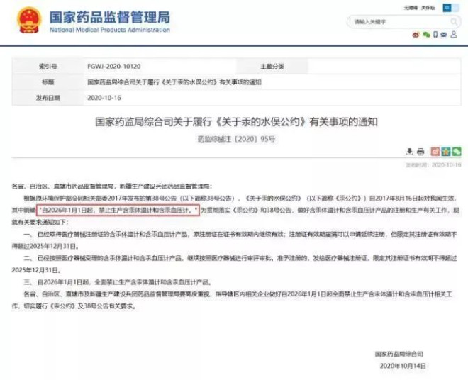 据极目新闻此前报道,早在2020年10月,国家药监局综合司就发布了《关于履行关于汞的水俣公约有关事项的通知》。《关于汞的水俣公约》自2017年8月16日起对我国生效,其中明确“自2026年1月1日起,禁止生产含汞体温计和含汞血压计。”