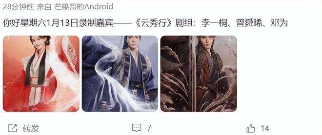 从网上传出的消息上看,《云秀行》中的李一桐、曾舜曦、邓为将录制《你好星期六》,而参与综艺节目录制,意味着这部剧即将与我们见面,官方进入宣传期。