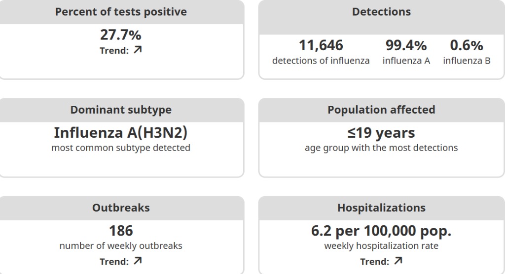 截至 12 月 13 日当周,加拿大共报告 11,646 例新流感病例,全国检测阳性率达到 27.7%。