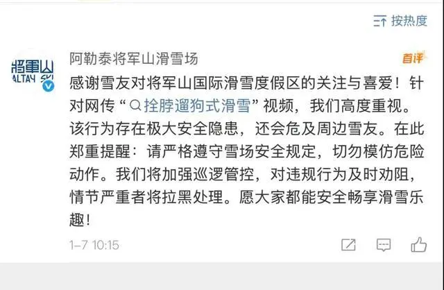 针对此视频,阿勒泰将军山滑雪场在网上回应,感谢雪友对将军山国际滑雪度假区的关注与喜爱。针对网传“拴脖遛狗式滑雪” 视频,我们高度重视。该行为存在极大安全隐患,还会危及周边雪友。在此郑重提醒:请严格遵守雪场安全规定,切勿模仿危险动作。我们将加强巡逻管控,对违规行为及时劝阻,情节严重者将拉黑处理。