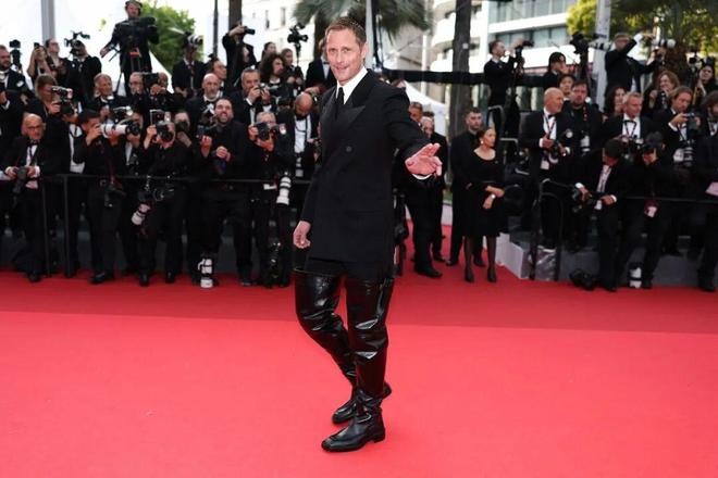 在戛納,你在造型上玩得很開心。我的靈感來自電影裡的角色們。英國的“同志摩托車俱樂部”(GBMCC)成員參與了電影拍攝,他們穿著全套裝備,包括束縛帶,來到戛納首映式。其中壹位還帶來了他的“幼犬面具”。穿著常規的黑色燕尾服亮相顯得太無聊了。我想為紅毯帶來壹點皮革元素。