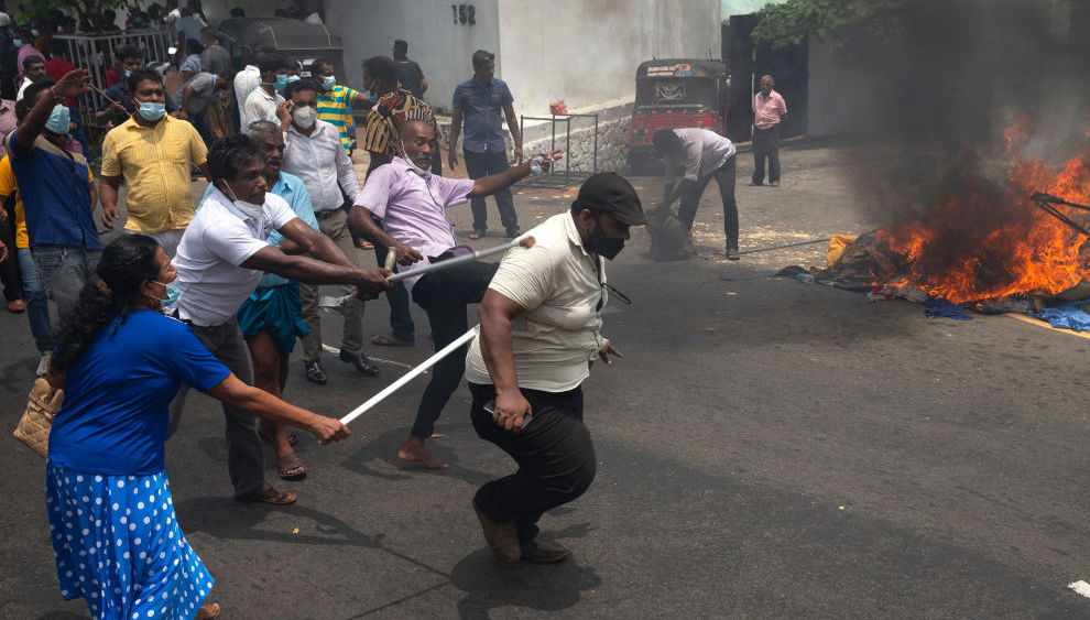 圖為斯裡蘭卡暴亂中,親政府人士在攻擊壹名抗議人士。(圖片來源:Buddhika Weerasinghe/Getty Images)