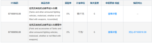 点开详情,我们可以看到坦克的申报要求和其他详细信息,例如税率,检验检疫类别和监管条件等等。这里的英文名称更加详细,提到了“不论是否装有武器”。也就是说即使拆除了火炮和机枪,也需要按照坦克来申报。