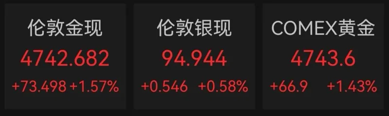 貴金屬方面,現貨黃金盤中突破4750美元,再度刷新歷史新高。截至發稿,現貨黃金漲1.57%,報4742.682美元/盎司,現貨白銀報94.944美元/盎司,日內上漲0.58%,年內累計漲幅超過30%。