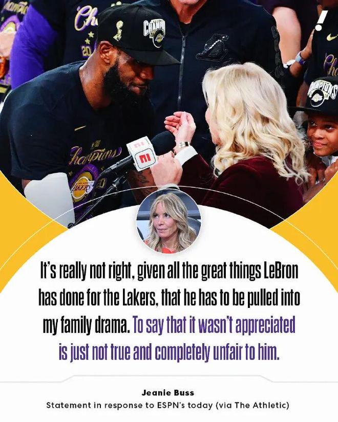 ESPN報道稱,2018年,詹姆斯主動加盟湖人,輿論普遍認為是詹姆斯選擇了湖人,湖人沒有因為成功招募到詹姆斯而獲得贊譽,這壹點令珍妮感到不悅。