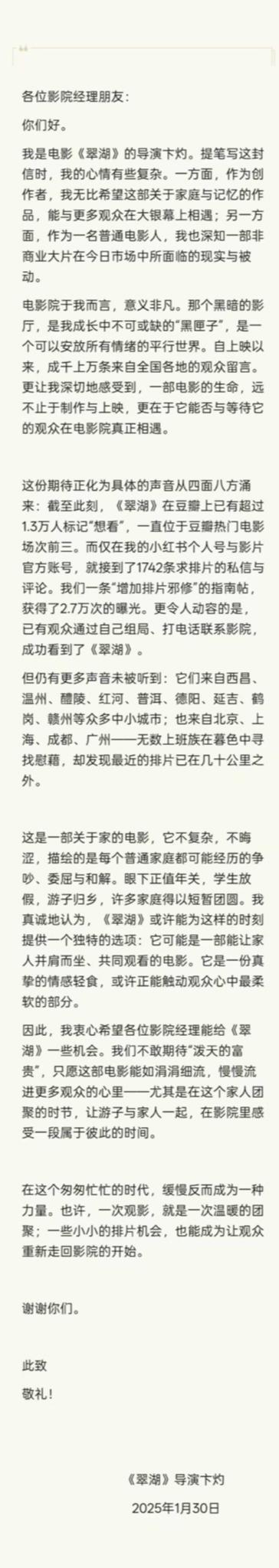 隨卞灼的公開信共同發出的,還有電影《翠湖》發行方同步啟動的全國排片征集。知名電影博主,山東影院經理“董小姐聊電影”在微博上表示,“《翠湖》是非常難得的親情電影,在電影裡我們能夠看到同頻共振的中國人獨有的家庭情感。 發行方今天也開始全國范圍征集願意排片的影院,已經報名了!”制片人、影評人藤井樹同樣公開支持卞灼的求排片訴求,呼吁影院 “不如給《翠湖》壹個機會”,提出 “觀眾嗷嗷待哺,影院也在尋找觀眾,雙方匹配或許是共贏”。