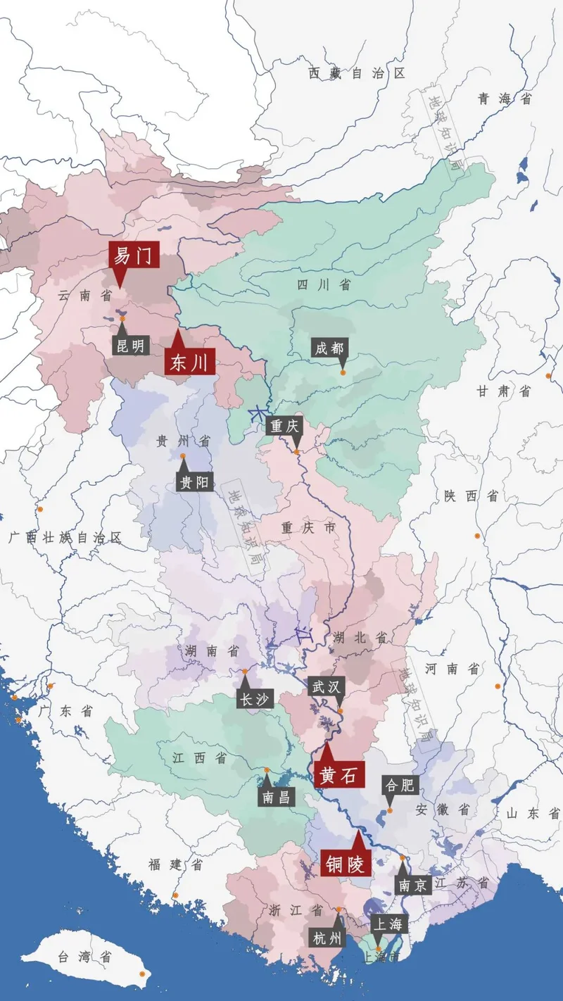 如果我们把南方这些大铜矿标出来,就会发现它们大多沿长江分布,而四大铜枯竭城市,就两两分布其中。