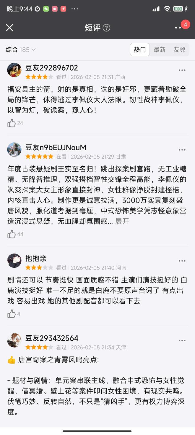 首播口碑也出来了,大部分观众给出了好评,夸赞剧情节奏,夸赞服化道。前几集没有恋爱戏份,一直在破案,悬念迭起。服化道是真的好,每一帧都看出有钱。画面构图精致,光影氛围营造极佳,唐风美学和悬疑张力交融,画面和配乐古韵十足,展现出不俗的品质。