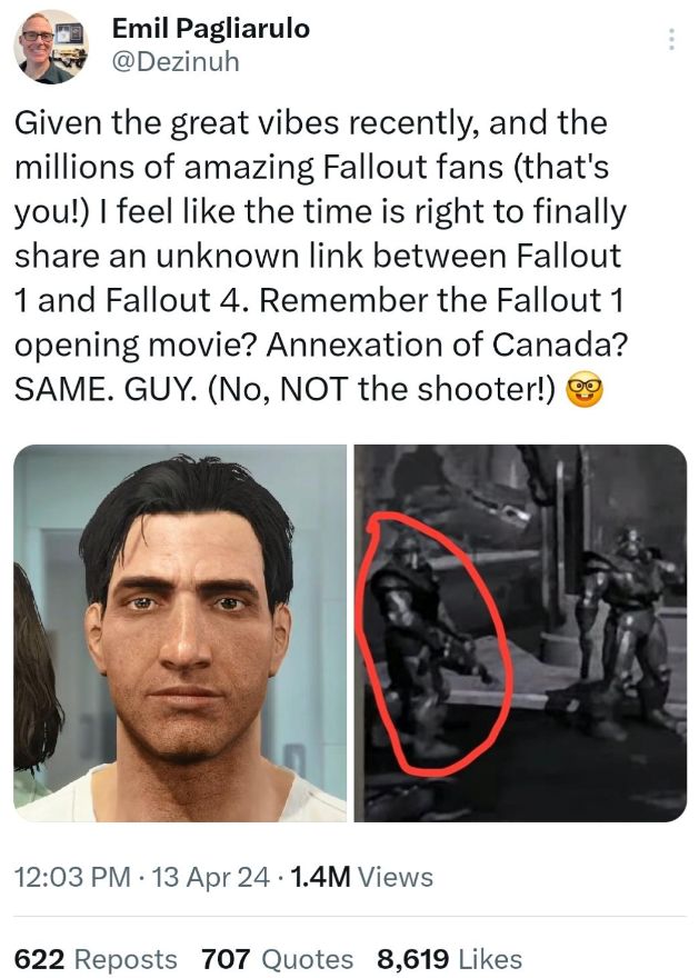 更黑色幽默的是,这个虐杀平民的大兵,真不一定只是背景。因为,Bethesda的编剧Emil Pagliarulo曾自作聪明地向玩家暗示,《辐射4》与初代《辐射》的开场动画,存在着密切联系——换句话说,《辐射4》的主角老冰棍,就是这名战犯。