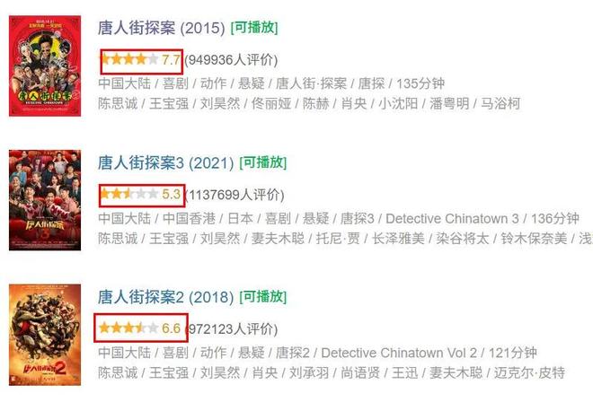 但从2021年《唐探3》开始,系列口碑一路滑坡,豆瓣评分跌至5.3。
