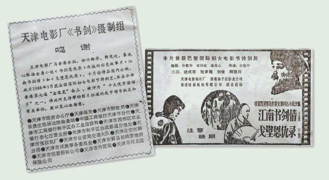 大侠千古,满屏刷“金”。偶然翻到1987年9月21日《天津日报》刊登的电影广告及鸣谢公告(上图),发布方为《江南书剑情》《戈壁恩仇录》摄制组,明眼人一看即知,这分别是同一部电影的上下集片名。内地影人首度根据金庸武侠小说改编的电影,快要上映啦!