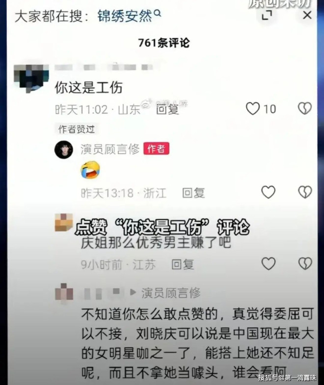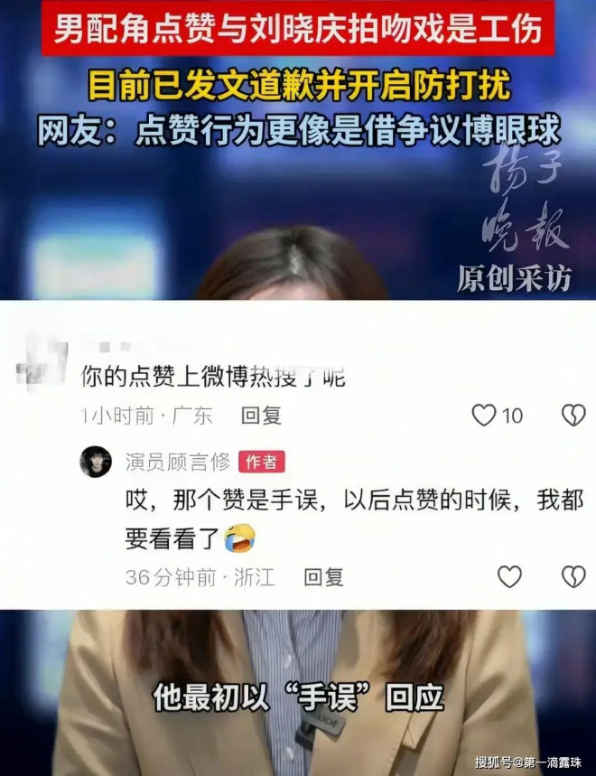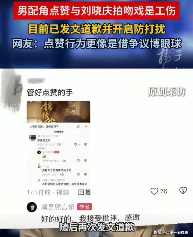 本來吻戲就夠有爭議了,合作的男配角又來添亂,直接把熱度推上了頂峰。這個男配角沒有和劉曉慶拍吻戲,卻在網友調侃“和劉曉慶搭戲是工傷”的評論下面點了贊,這壹下直接炸了鍋。