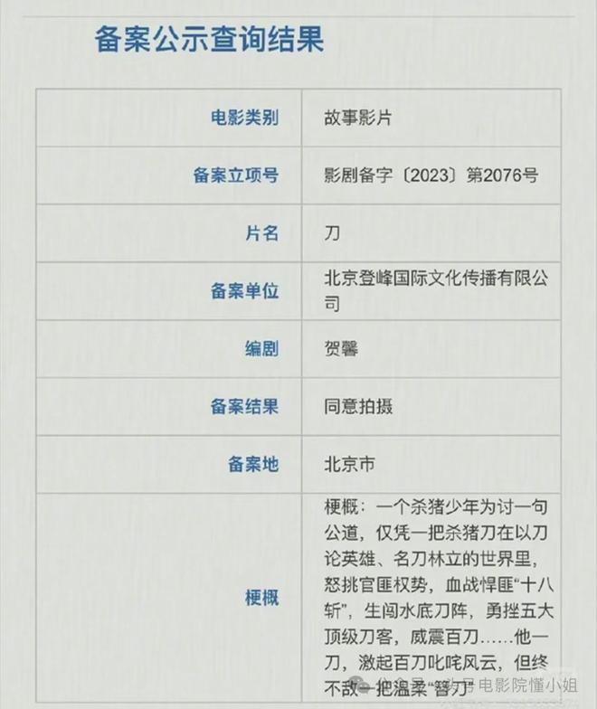 《刀》的劇本早在2023年就已完成備案,編劇是賀馨,備案單位正是吳京的北京登峰國際。