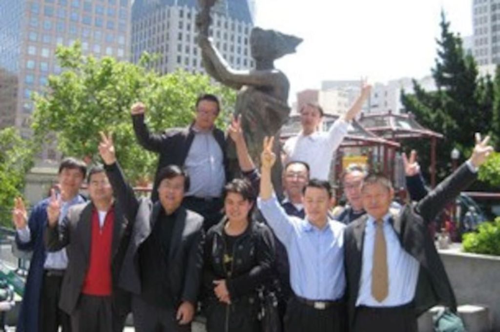 2010年6月,多位中国民运人士,包括周锋锁、封从德、刘俊(右一)等人前往旧金山唐人街花园角广场,清洗民主女神像,以纪念“六四”21周年。(图片来源:rfa)