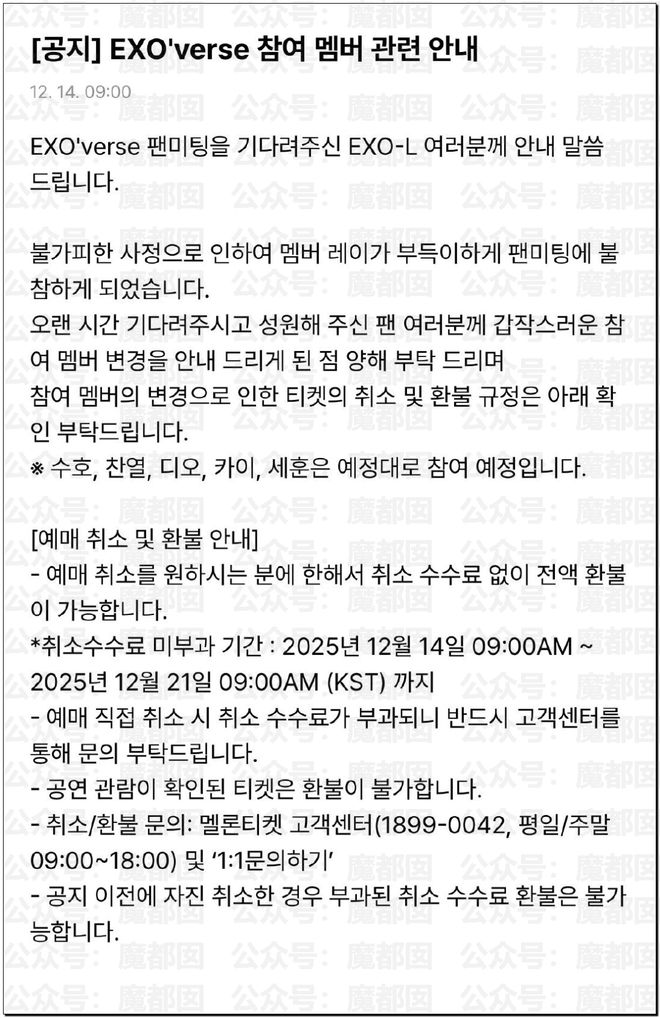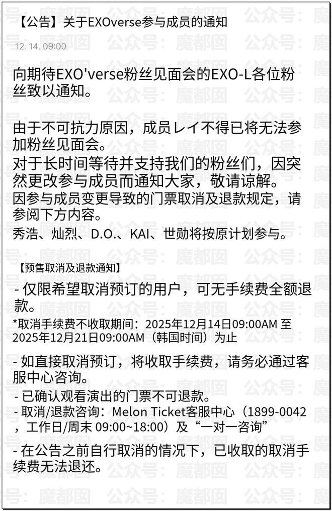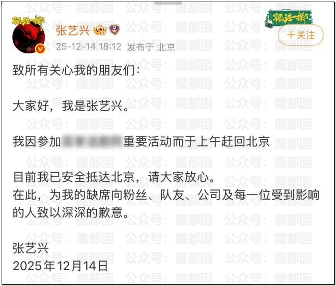 sm公司于12.14,上午9:00发布公告,张艺兴称其因“不可抗力”缺席当天的活动。