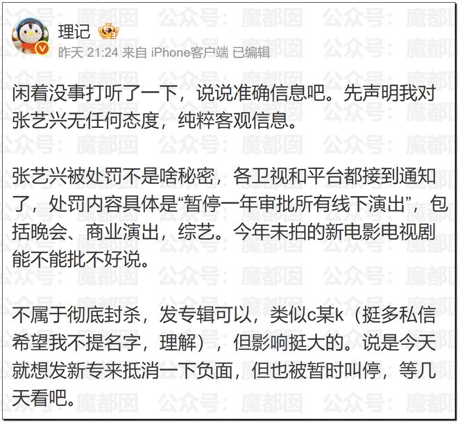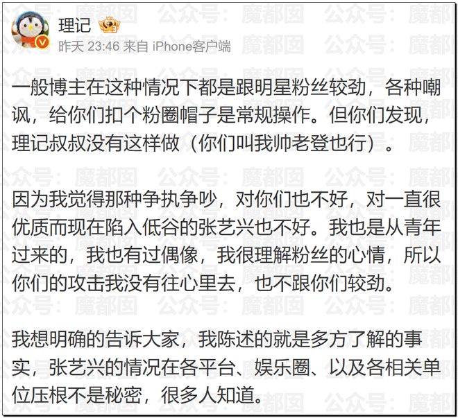 不,在张艺兴方面发了声明的前提下,前面提到的大V理记依然选择硬刚,明确表示张艺兴的这个声明避重就轻,事实上就是被处罚了: