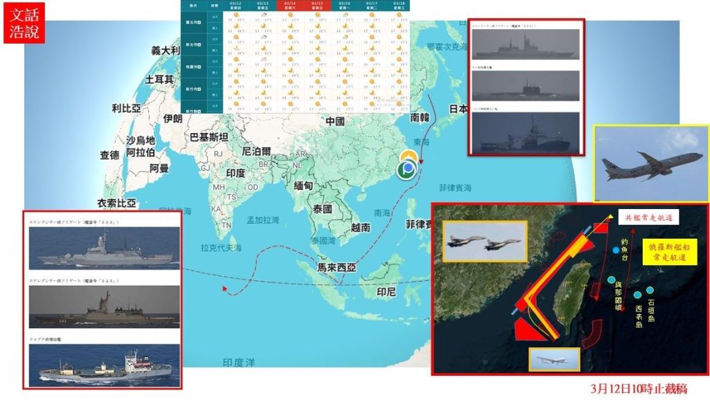 3月6日及10日日本防衛省統合幕僚監部罕見,針對俄羅斯太平洋艦隊潛艇編隊進行航程公布:3月5日(星期肆)晚約22時,俄羅斯海軍壹艘守護級護衛艦/335、 壹艘基洛級潛艇和壹艘布克級遠洋拖船,在日本長崎縣對馬島東北約60公裡海域,向西南方向移動。 隨後5日(星期肆)至6日(星期伍)期間,經由對馬海峽向西南方向航行,駛往東海。 9日(星期壹)下午約16時,在日本西南諸島的西表島以北約50公裡的海域活動。 隨後向西南方向航行,進入與那國嶼和西表島之間的海域,駛向太平洋。 此相對地,發現共艦由東海南下,常航經台灣與日本與那國嶼間水域不同(如附圖); 期間,筆者在6日壹度懷疑,中俄可能將在東海進行中俄潛艇聯合巡航任務。 幸好,等待個4天,日方再度公布俄羅斯潛艇編隊續向南航行。