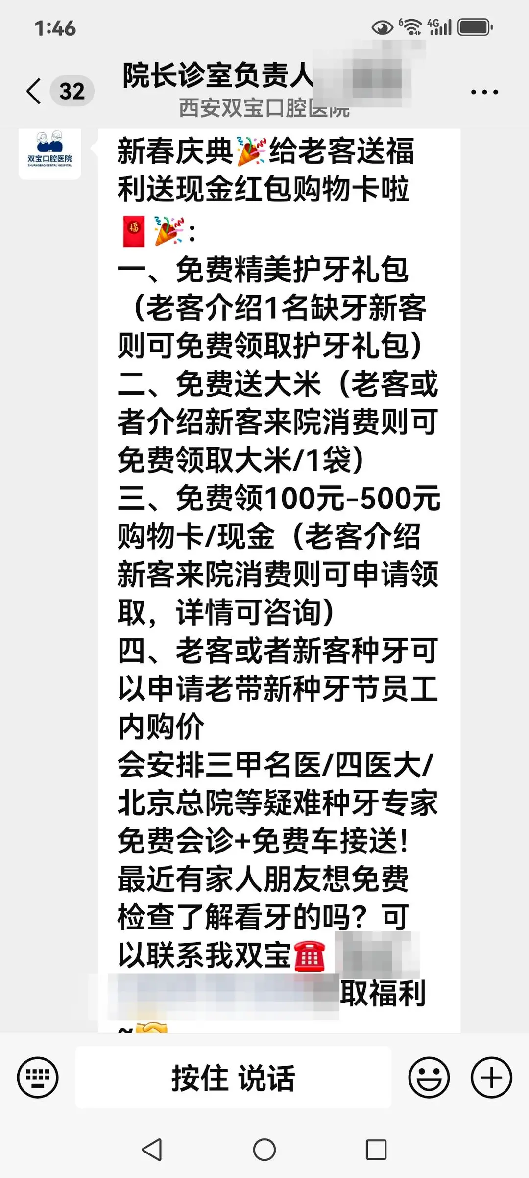 ▲双宝口腔医院促销人员发布的信息 受访者供图