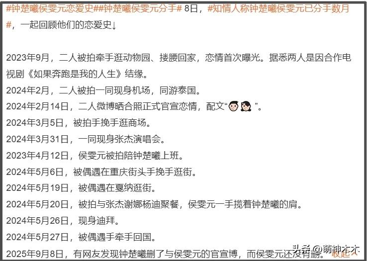 再來就是和33歲女星鍾楚曦的戀情了,贰人2023年被拍,2024年官宣,2025年分手,戀愛時間不算長,但網友的爆料剛剛好發生在兩年時間內。