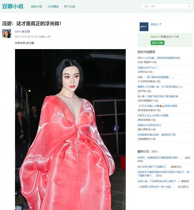 2023年10月4日,范某参加釜山国际电影节在红毯上,这次她是以电影主演身份出席的,其中一套粉色的红毯服装来自叙利亚设计师品牌Rami Al Ali,豆瓣上便有了《浣碧:这才是真正的浮光锦!》的帖子,一下子就在原本纷杂“浮光锦”定义市场里砸下猛雷,从此这种具有幻彩效果的面料才更适合被称作“浮光锦”逐渐占据上风。