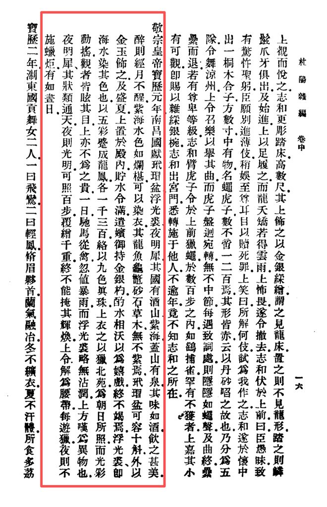 敬宗皇帝宝历元年,南昌国献玳瑁盆、浮光裘、夜明犀。其国有酒山、紫海。盖山有泉,其味如酒,饮之甚美,醉则经月不醒。紫海,水色如烂椹,可以染衣。其龙鱼龟鳖、砂石草木,无不紫焉。玳瑁盆可容十斛,外以金玉饰之。及盛夏,上置于殿内,贮水令满,遣嫔御持金银杓酌水相沃以为嬉戏,终不竭焉。浮光裘,即海水染其色也,以五彩蹙成龙凤,各一千三百,络以九色真珠。上衣之以猎北苑,为朝日所照,而光彩动摇,观者皆眩其目,上亦不为之贵。一日,驰马从禽,忽值暴雨,而浮光裘略无沾润,上方叹为异物也。夜明犀,其状类通天,夜则光明可照百步,覆缯千重,终不能掩其辉焕。上令解为腰带,每游猎,夜则不施蜡炬,有如昼日。