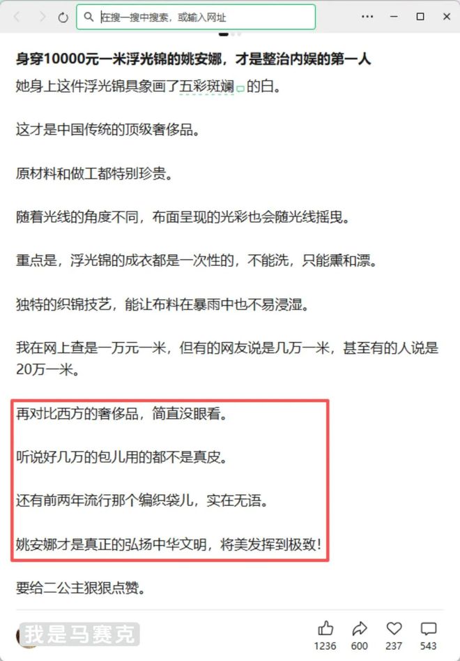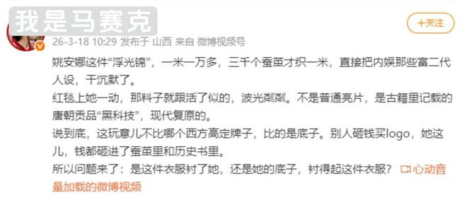 套用心理学上的一个观点:“人不是为事情困扰着,而是被对事情的看法困扰着”。同样的,在这件事上大家从头到尾也没有被所谓稀缺的、珍贵的、古老的工艺面料所折服,因为它们从来没被真实化过,大家只是沉浸在虚假的文化滤镜、幻想的高级感叙事,还有媚富的价值想象之中。没错,姚安娜的身份也成为了这场舆论高潮里重要的注脚。
