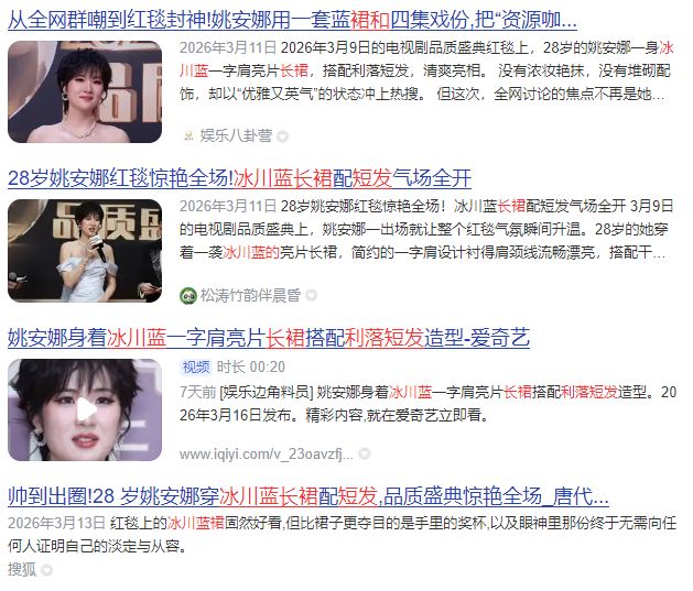 在3月15日之前,对于这个造型的主要描述是“冰川蓝的长裙”“利落短发”,活动官方微博措辞拔高了些许格调,称作“素色唐袍”。