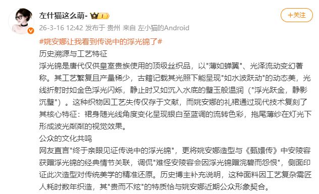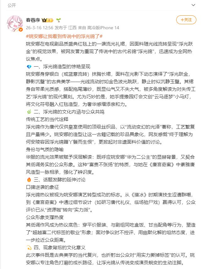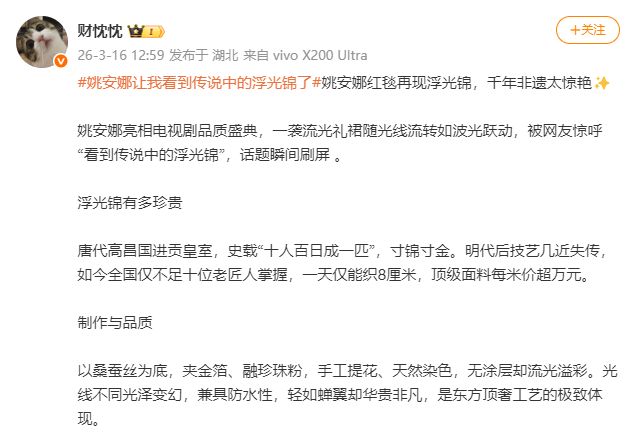 直到……直到“浮光锦”这个概念陡然被扣在了这条裙子上!3月16日中午开始,有好几位博主根据“浮光锦”三字编造小作文,并集中在。从价格到工时,从文化内涵到非遗工艺,说得是有鼻子有眼。