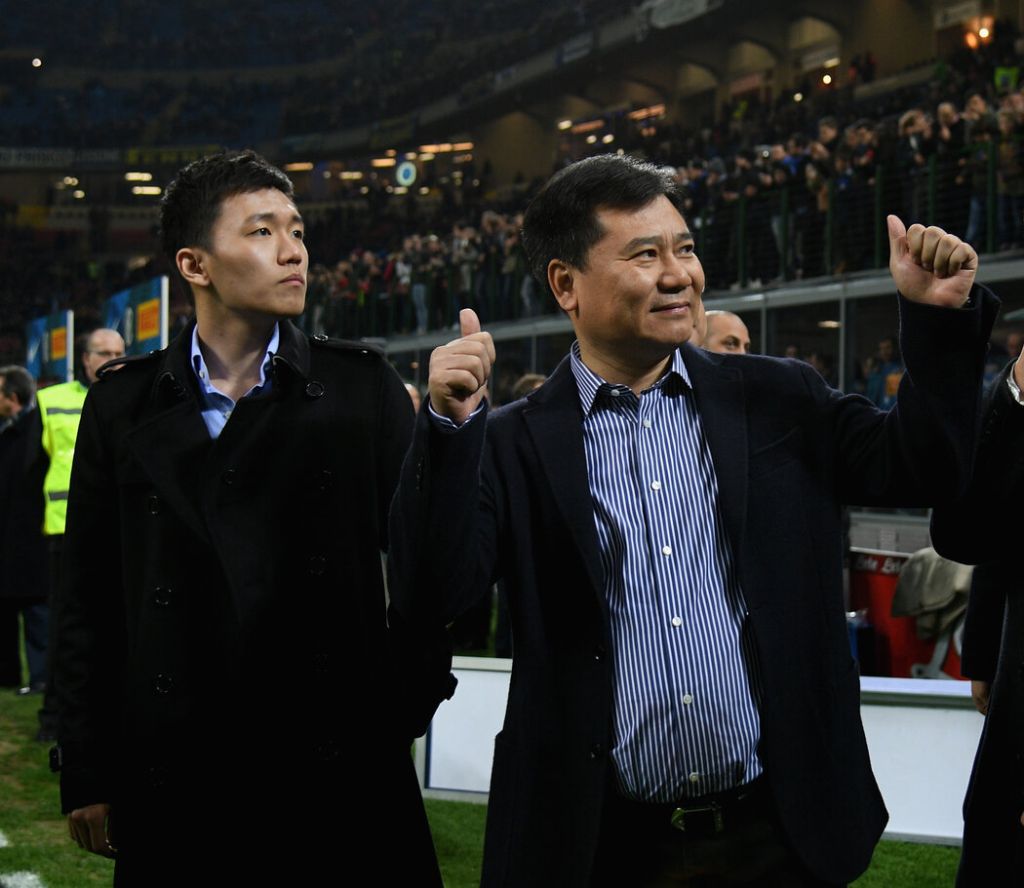 资料照片 苏宁董事长兼创始人张近东(右)和儿子张康阳(Claudio Villa - Inter/FC Internazionale via Getty Images)
