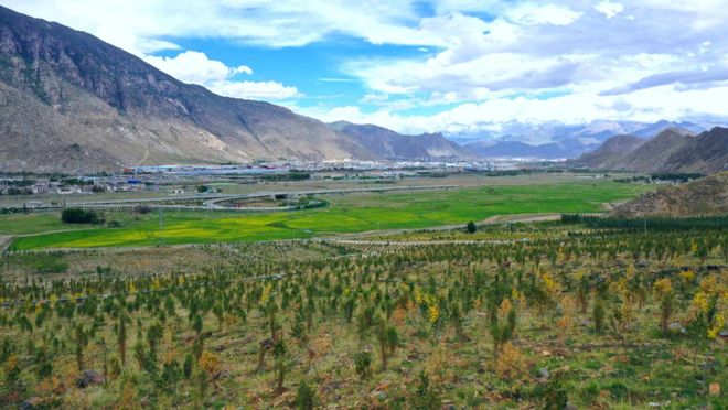 中国交建扎根拉萨南北山绿化工程堆龙、曲水任务区,创新应用无人机运苗、智能喷灌技术,选育抗寒耐旱乡土苗木,完成封山育林4055亩、植苗造林8000亩,累计种植苗木88.8万株,筑牢高原生态安全屏障。