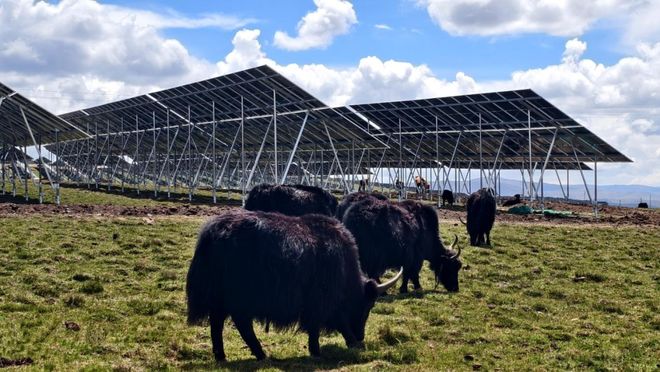 中国建筑旗下中建二局承建四川阿坝红原雅克光伏电站,在海拔3600米区域建设250兆瓦光伏项目,设置2米高光伏支架实现 “板上发电、板下养殖”,科学养护1.8万平方米高原草甸,年发电量约4.5亿千瓦时,年减碳约40万吨,实现生态修复与牧民增收双赢。