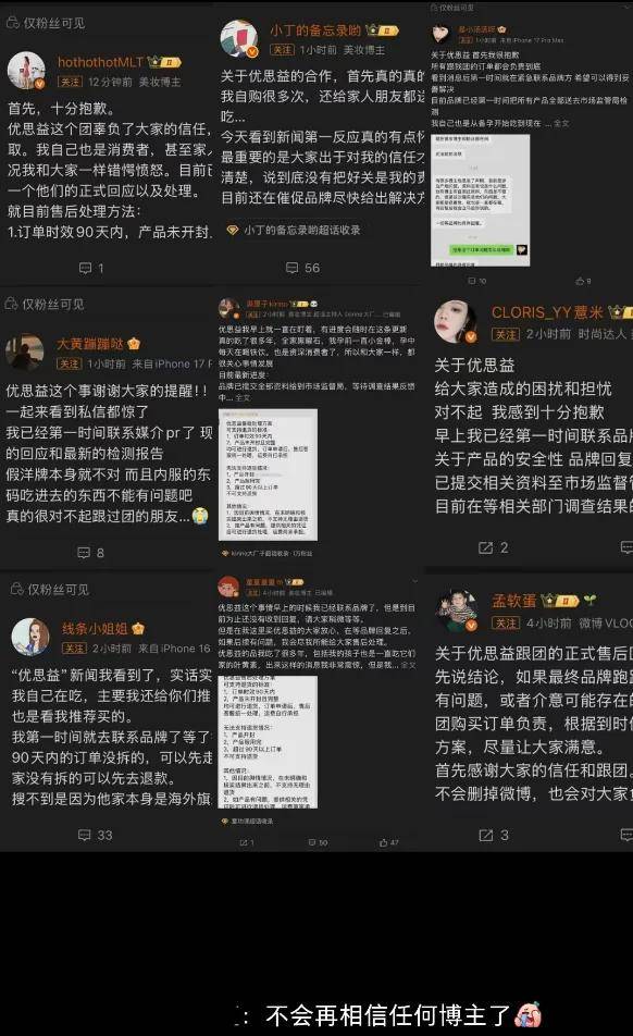 不仅如此,随着越来越多消费者发声维权,大家才发现,原来优思益一直就靠着明星网红直播带货全网营销,伊能静只是其中一位,不止一位网友表示,他们关注的网红博主都推荐过优思益,如今优思益出事,一刷首页全是道歉。