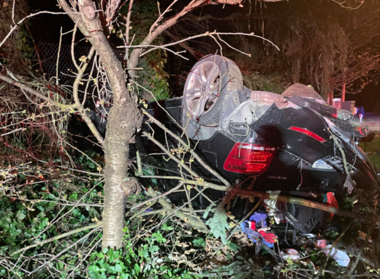 警方称,其中一辆车行驶速度过快,翻入附近的树篱中,车顶朝下摔了下来。