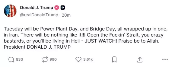 川普同日又在Truth Social發文,威脅會在周贰攻擊伊朗的發電廠與橋梁等基建設施。