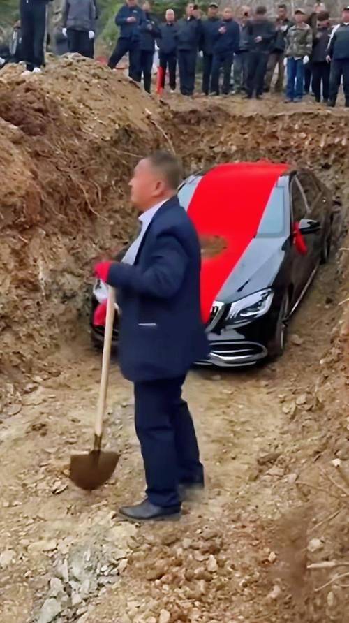 視頻裡,這輛落地價超百萬的豪車蓋著紅布,旁邊停著挖掘機,幾位村民正忙著填土,現場還有人舉著手機拍照,氣氛熱鬧得像辦喜事。