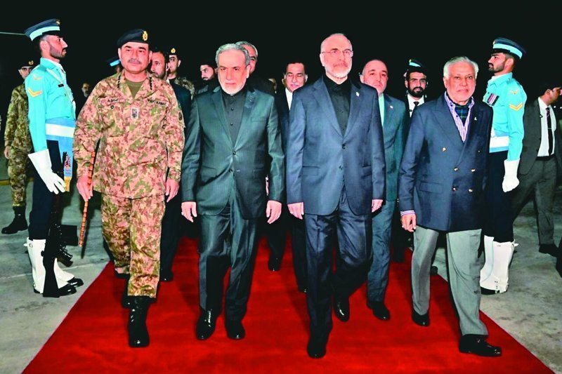 巴基斯坦副总理达尔(右)在机场迎接伊朗议长卡利巴夫(右二)、伊朗外长阿拉奇(左二)。 (欧新社)