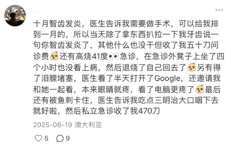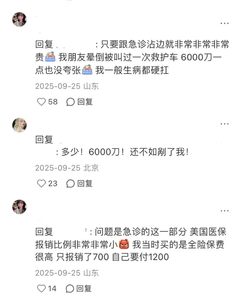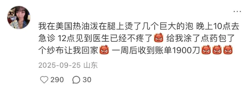 一位网友在美国留学时,腿被热油烫伤起泡,等了两个小时才看到医生,只是被涂了药、包了纱布,一周后却收到了1900刀的账单。自媒体博主“逻辑医学”曾分享过美国急诊室的费用构成,包括设施费、医生费、检查和治疗费还有药品费,普通感冒急诊费500刀起,轻微割伤缝针要1000刀,重症或入院治疗则要上万美金。
