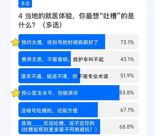 土土曾在留学群里做过一个小调研,400多人的投票结果显示,近8成留学生承认用AI看过病。而大家在国外看病的难题,除了觉得价格贵,还有83.8%的留学生是担心医生水平,怕被误诊,也有73.1%苦于预约太慢,排到号的时候病都好了。