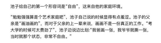 池子的爸爸是壹位油畫家,考大學的時候,因為畫畫聽起來不像壹份正經工作,池子爸爸畫壹張,爺爺撕壹張。後來定居北京,家裡也很空,直到池子爸爸的畫賣出去,才添置了家具。