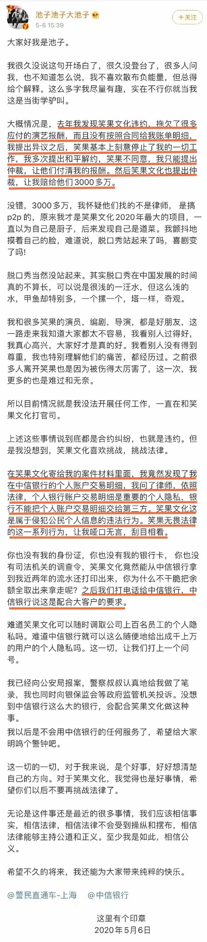 當時池子在北京說脫口秀,壹個月只有幾百塊的商演收入,拿到手時有零有整。而笑果文化開出的條件是壹個月壹萬塊的基本工資和演出分成。